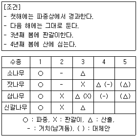 다음의 표를 참고하여 아래 조건에 대하여 적합한 수종은?