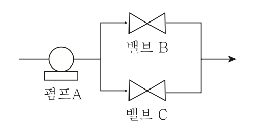 [그림]과 같이 신뢰도 95[%]인 펌프 A가 각각 신뢰도 90[%]인 밸브 B와 밸브 C의 병렬밸브계와 직렬계를 이룬 시스템의 실패 확률은 약 얼마인가?