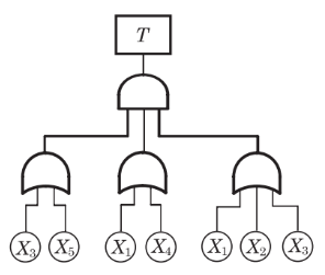다음 그림과 같이 FTA로 분석된 시스템에서 현재 모든 기본사상에 대한 부품이 고장난 상태이다. 부품 X1X_1부터 부품 X5X_5까지 순서대로 복구한다면 어느 부품을 수리 완료하는 순간부터 시스템은 정상 가동이 되겠는가?
