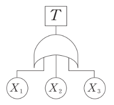 그림과 같은 FT도에서 정상사상 T의 발생 확률은? (단, X1,X2,X3X_1,X_2,X_3의 발생 확률은 각각 0.1, 0.15, 0.1이다.)