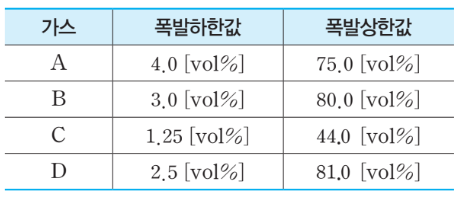 다음 [표]의 가스(A~D)를 위험도가 큰 것부터 작은순으로 나열한 것은?