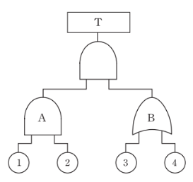 다음 그림의 결함수에서 최소 패스셋(minimal pathsets)과 그 신뢰도 R(t)는? (단, 각각의 부품 신뢰도는 0.9이다.)