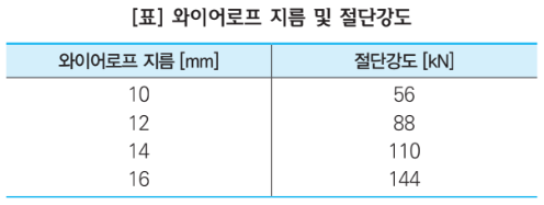 어떤 양중기에서 3,000[kg]의 질량을 가진 물체를 한쪽이 45[°]인 각도로 그림과 같이 2개의 와이어로프로 직접 들어올릴 때, 안전율이 고려된 가장 적절한 와이어로프지름을 표에서 구하면? (단, 안전율은 산업안전보건법령을 따르고, 두 와이어로프의 지름은 동일하며, 기준을 만족하는 가장 작은 지름을 선정한다.)