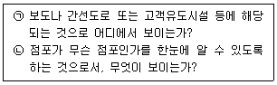 점포의 입지조건을 평가할 때 핵심적 요소가 되는 시계성은 점포를 자연적으로 인지할 수 있는 상태를 의미한다. 시계성을 평가하는 4가지 요소들을 정리할 때 아래 글상자 ㉠과 ㉡에 해당되는 용어로 가장 옳은 것은?