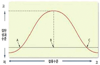조직 내 갈등수준과 집단성과수준에 관한 그래프이다. 해석한 것으로 옳은 것은?