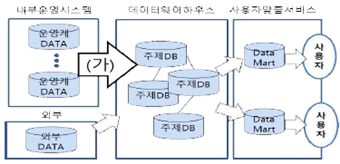 다음은 데이터웨어하우스를 구축하고, 사용자에게 필요에 맞는 정보를 제공해 주는 데이터 마트를 구축한 개념도이다. 그림의 (가)에 해당하는 기술 용어로 가장 옳은 것은?