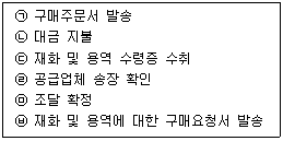 아래 글상자는 공급사슬관리를 위한 제조업체의 구매-지불 프로세스의 핵심 기능이다. 프로세스 흐름에 따라 순서대로 나열한 것으로 옳은 것은?