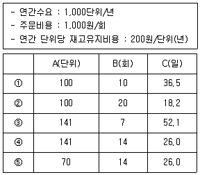어떤 기업에서 경제적 주문량모형을 이용하여 재고정책을 수립하려고 한다. 관련 자료가 아래와 같을 때 경제적 주문량 단위(A), 그 때의 연간 최적 주문횟수(B) 및 최적 주문주기일(C)을 올바르게 나열한 것은?