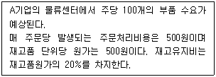 다음 내용을 토대로 하여 경제적 주문량(EOQ)을 구하면? (단, 1년은 52주로 적용하고 EOQ 산출값은 소수점 첫째자리에서 내림한다.)