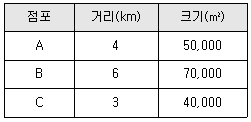 A, B, C 세 점포의 크기와 소비자의 집으로부터 점포까지의 거리는 아래와 같다. 이 경우 Huff 모델을 적용하였을 때 이 소비자가 구매확률이 가장 높은 점포 및 그 점포를 선택할 확률은? (가정 : 이 소비자는 다음의 세 점포들에서만 상품을 구매할 수 있음. 소비자가 부여하는 점포 크기에 대한 효용은 1, 거리에 대한 효용은 -2임.)