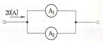 그림과 같은 회로에서 최대눈금 15[A]의 직류 전류계 2개를 접속하고 전류 20[A]를 흘리면 각 전류계의 지시는 몇 [A]인가? (단, 전류계 최대 눈금의 전압강하는 A₁이 75[mV], A₂가 50[mV])