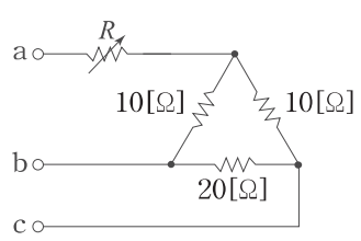 그림과 같은 순저항으로 된 회로에 대칭 33상 전압을 가했을 때 각 선에 흐르는 전류가 같으려면 R[Ω]R[\Omega]의 값은?