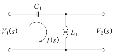V1(s)V_1(s)을 입력, V2(s)V_2(s)를 출력이라 할 때, 다음 회로의 전달함수는? (단, C1=1[F]C_1=1[F\mathrm{F}], L1=1[H]L_1=1[H\mathrm{H}])
