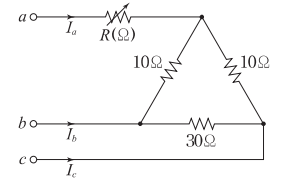 저항만으로 구성된 그림의 회로에 평형 33상 전압을 가했을 때 각 선에 흐르는 선전류가 모두 같게 되기 위한 [Ω][\Omega]의 값은?