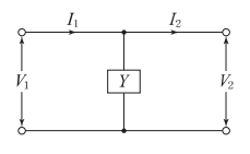 어드미턴스 Y[]Y[\mho]로 표현된 44단자 회로망에서 44단자 정수 행렬 TT는? (단, [V1I1]=T[V2I2], T=[ABCD]\begin{bmatrix} V_1 \\I_1\end{bmatrix}=T\begin{bmatrix} V_2 \\ I_2 \end{bmatrix},\ T=\begin{bmatrix} A&B\\C&D \end{bmatrix})