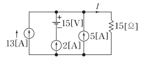 그림과 같은 회로에서 15[Ω]15[\Omega]에 흐르는 전류는 몇 [A]\rm[A]인가?