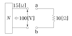 그림에서 a,b\rm a,b 단자의 전압이 100[V]100\rm[V], a,b\rm a,b에서 본 능동 회로망 NN의 임피던스가 15[Ω]15[\Omega]일 때, a,b\rm a,b 단자에 10[Ω]10[\Omega]의 저항을 접속하면 a,b\rm a,b 사이에 흐르는 전류는 몇 [A]\rm[A]인가?