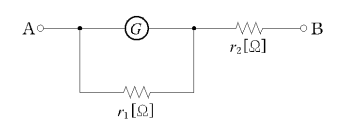 저항 RR인 검류계 GG에 그림과 같이 r1r_1인 저항을 병렬로, 또 r2r_2인 저항을 직렬로 접속하였을 때 A,B\rm A, B 단자 사이의 저항을 RR과 같게 하고 또한 GG에 흐르는 전류를 전 전류의 1/n1/n로 하기 위한 r1[Ω]r_1[\Omega]의 값은?