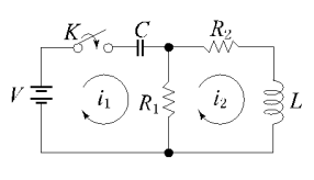 다음 회로에서 t=0t=0일 때 스위치 KK를 닫았다. i1(0+),i2(0+)i_1\left(0_{+}\right), i_2\left(0_{+}\right)의 값은? (단, t<0t<0에서 CC전압과 LL전압은 각각 0[V]\rm 0[V]이다.)